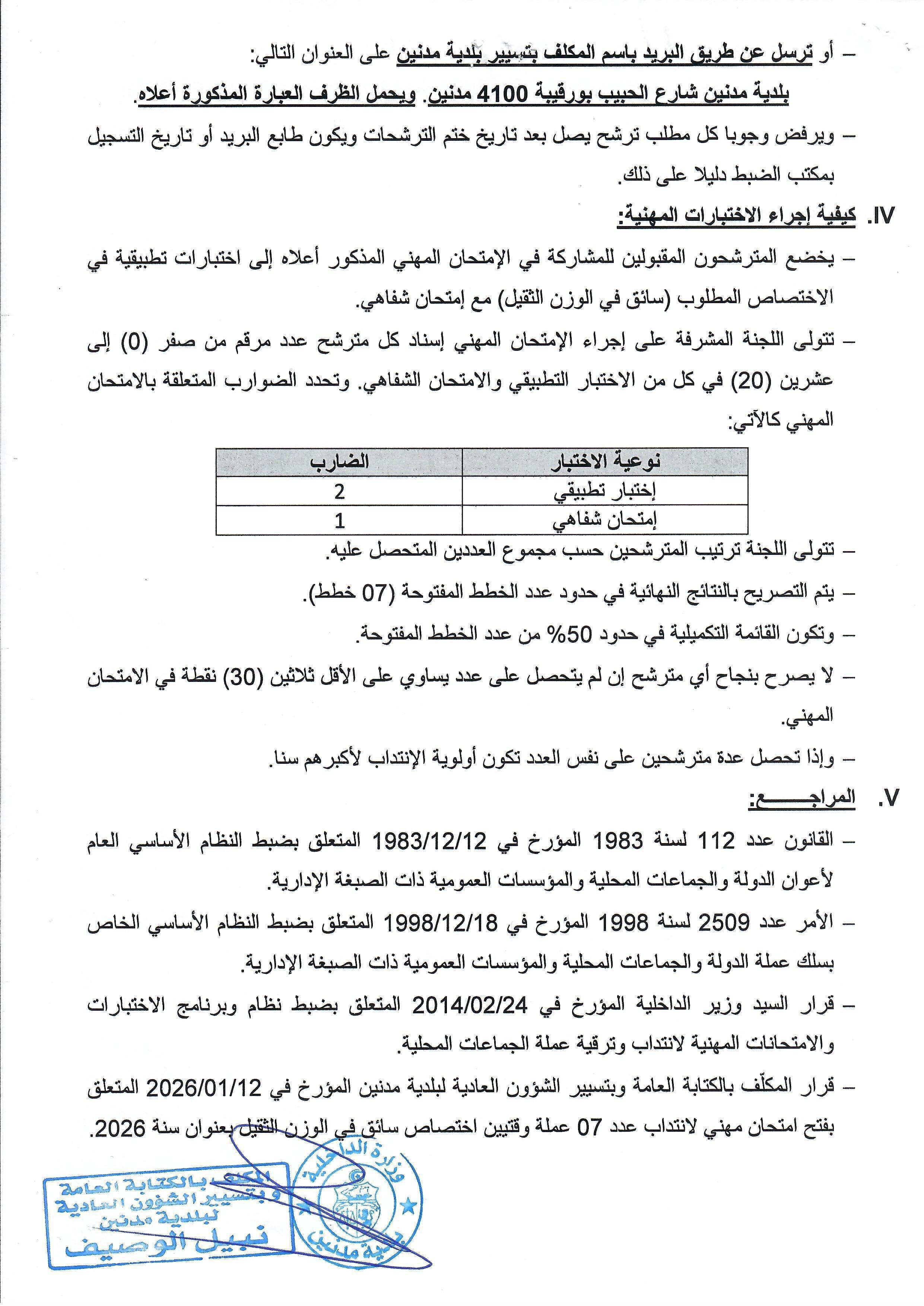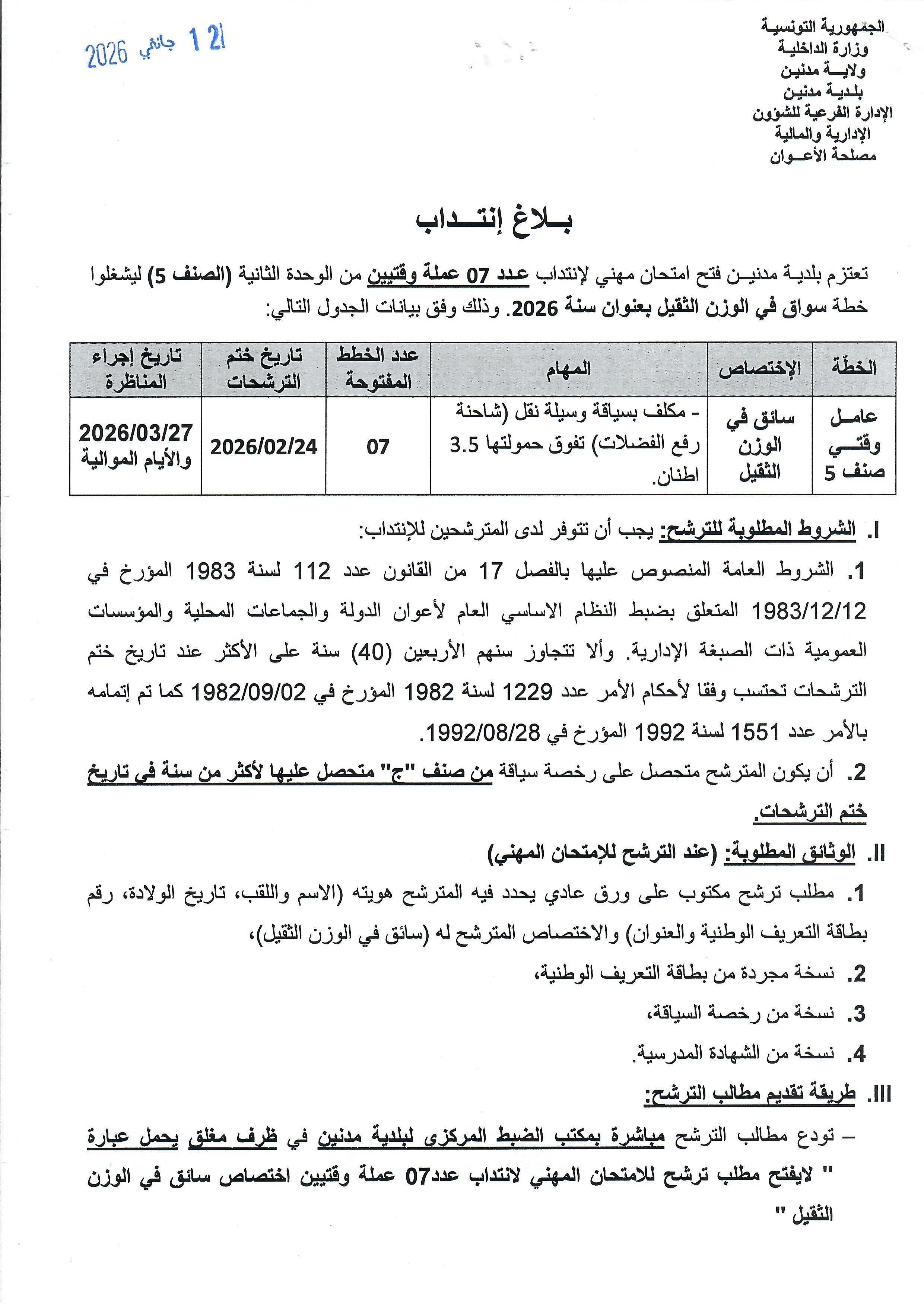 بــلاغ فتح امتحان مهني لإنتداب عـدد 07 عملة وقتيين من الوحدة الثانية (الصنف 5) ليشغلوا خطة سواق في الوزن الثقيل بعنوان سنة 2026